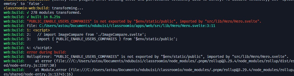 The classroomio and docs project required env variables before it could complete the build process. Instead of setting up a general .env file, adding the .env file to classroomio worked just fine.